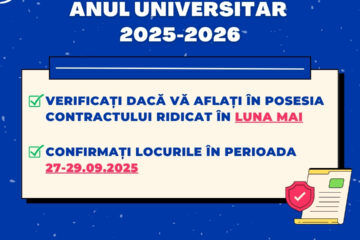 📄În atenția studenților care și-au ridicat contractul de cazare aferent anului universitar 2025-2026 în luna mai, ✅ Confirmarea locurilor la administrația căminului prin prezentarea uneia dintre copiile contractului se va face în perioada 27-29.09.2025 (vom reveni cu mai multe informații Read more…